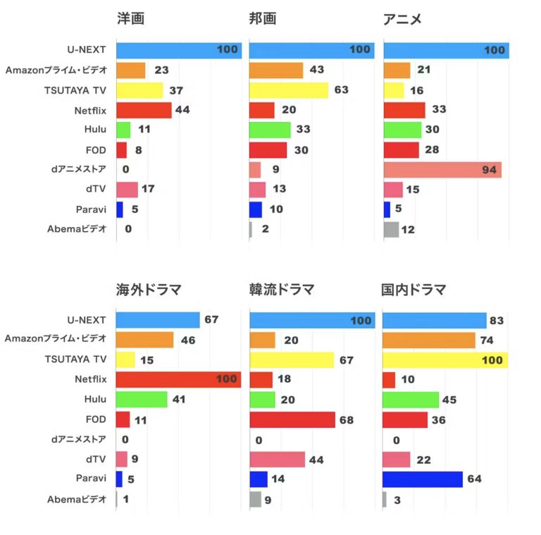 さらに、U-NEXTは日本のユーザーに特に人気の高い下記の主要ジャンル全てで、動画配信数No.1を誇っています。