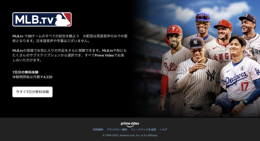また、MLB.TV(Amazon prime video)の7日間無料トライアルを利用しても、無料で視聴することができます。