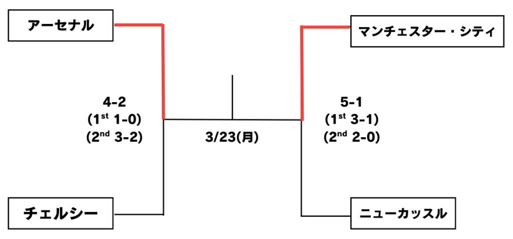 アーセナルとマンチェスター・シティが3/23(月)に行われる決勝戦で激突します。