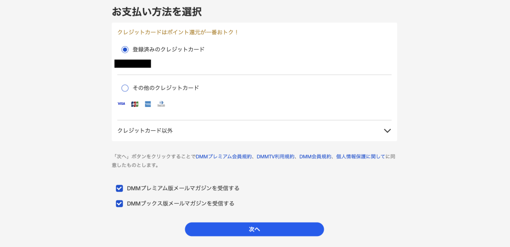 4.支払い内容、特典、支払い方法を選択し、「次へ」をクリックする