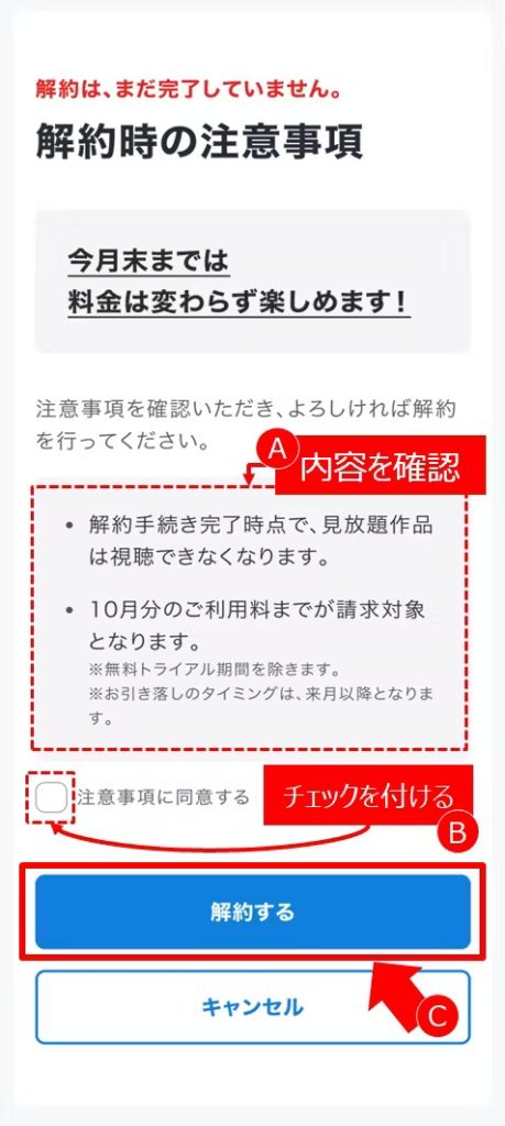 月額プランを解約する場合も同様に、Webサイトから登録した場合は解約直後に見放題作品が視聴できなくなるので、解約する場合は月末に行うのがベストです。