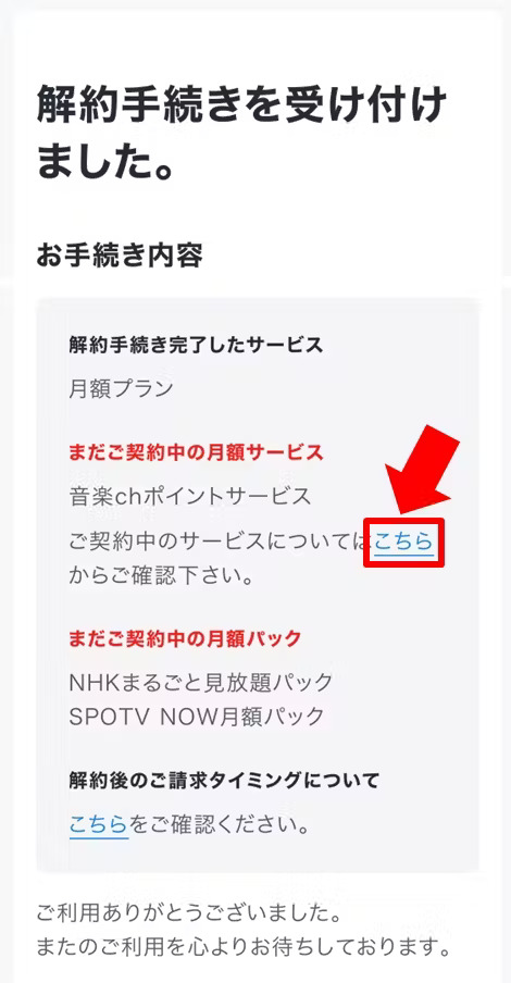 ⑧解約受け付け完了画面を確認し、[ ご契約中のサービスについてはこちら ] を選択