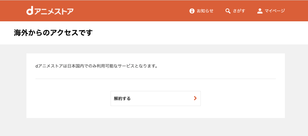 海外からdアニメストアにアクセスした場合、以下のように「海外からのアクセスです」と表示され視聴できない場合があります。